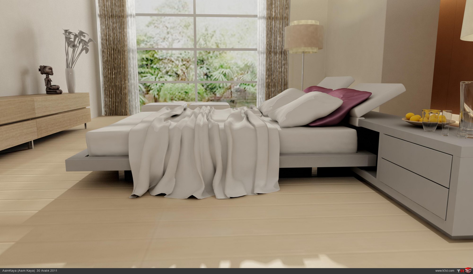 Bu renderi aldığım bilgisayarın özellikleri 4 gb ram 1 terabayt harddisk 64 bit i7 işlemcidir.Modellemeleri rhinoda yaptım yanlız çarşaf yastıklar ve afrika heykeli hazır modeldir.Çalışmam hobi amaçlıdır malum ticari calışmaları koymam uygun olmayabilir.Eleştirilerinize görüşlerinize her zaman açığım saygılar.