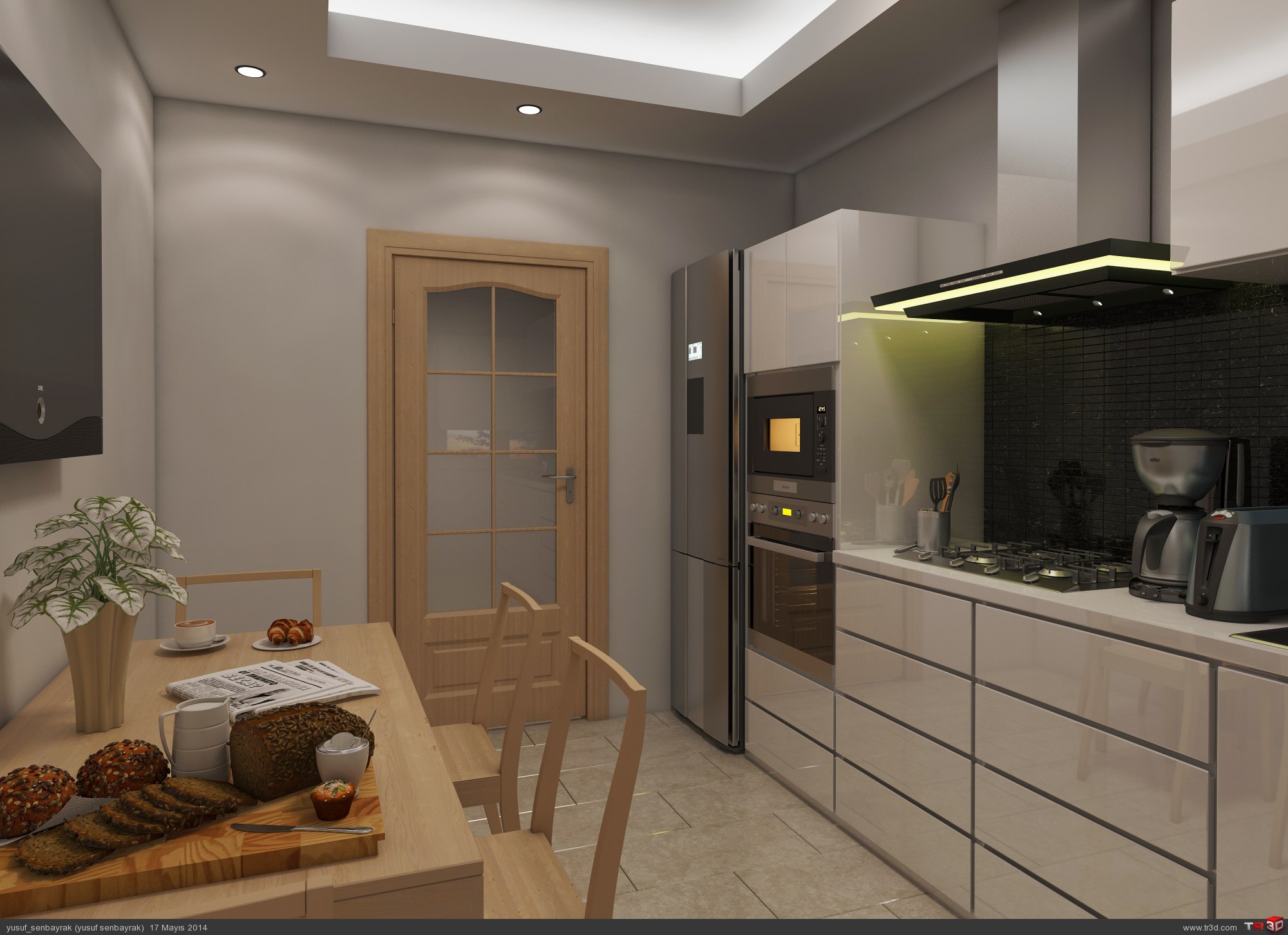elınıze sağlık dolap kapakları sıyah seramıkler kadar parlak yerdeki fayansların arasında derz yok tavandakı spotlarda hıc gercekcı durmuyor Yusuf bey renderın revıze edılmesı gerek masa uzerındekı hazır objelerı nereden ındırdınız herkesde bu objelerden var