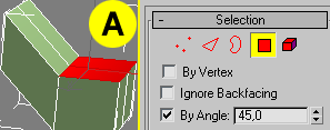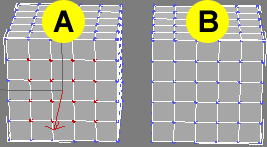 Ignore Backfacing: Alt objelerin hepsinde kullanılan çok kullanışlı bir seçenektir. Aktif edildiğinde seçim yapılan yüzeyin arkasında kalan kısımların seçilmesini engellemektedir. Uygulama resminde A objenin vertexlerinin seçildiği yüzey B ise aynı objenin Ignore Backfacing uygulanarak seçilemeyen arka yüzeyidir. |