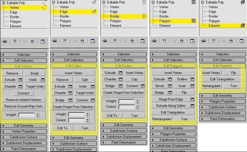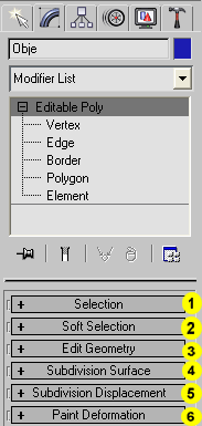 Poly nesnesinin sub-object(alt-obje) lerini seçerek aktif etmemizi sağlayan menüdür.Burada alt objeyi seçtiğimizde objenin ismi sarı bir renk alır.Kullanmış olduğumuz alt objeden çıkmak istediğimizde tekrar sarı yanan isme tıklamamız yeterlidir.