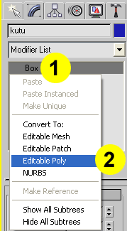 Yöntem 2:Objeyi seçtikten sonra Modify panelinden objenin ismine sağ tıklayarak çıkan menüden Editable Poly seçeneğini tıkladığımızda obje Poly nesnesine çevrilecektir. |