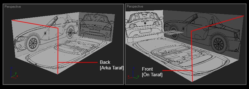 Sahnemiz işlemleri doğru yaptıysanız en son bu haliyle görünmesi gerekiyo side olarak belirttiğimiz blueprint RIGHT [1] konumundadır. 3D Max ilk açıldığında penceremiz left konumundadır. bunu manuel değiştirmeniz gerekiyo yoksa blueprint´i yandan göremessiniz.