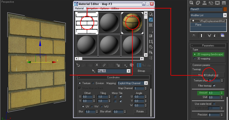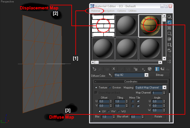 Displacement map´ımızı material editore normal kaplamalardan farklı şekilde yüklüyoruz. Material > Get Material [1] dedikten sonra bitmap kanalına displament map´ımızı yüklüyoruz. Malzememiz şekil [2] de olduğu görünür. Daha sonra diffuse map´ımızı [3] yükleyerek material editor´deki işimizi bitirdik.
