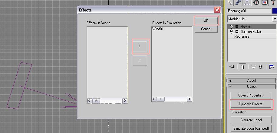 Bu işlemleri gerçekleştirdikten sonra da birde bu kumaşımızı uçuralım rüzgar uygulayalım. Bir Wind yaratalım ve kumaşımızın arkasına koyalım. Clothfx paneline geçip oradan Dynamic Effects i tıklayarak gördüğünüz gibi Wind nesnesi sol tarafta bunu sağ tarafa bakan bir ok var ona basarak Windi sağ tarafa atıyoruz.