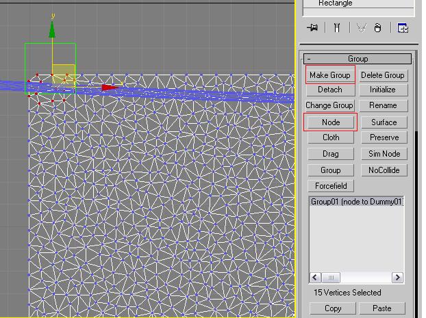 Cloth yi seçtikten sonra ok butonuna basarak bu paneldeki işlerimizi bitiriyoruz. Şimdi gelelim kumaşımızı mandallamaya. Nesnenin 2 ucuna birer Dummy yada birer box koyabilirsiniz sorun olmaz bunları sadece bir tutucu olarak kullanacağımız için sorun olmayacaktır. Şimdi tekrar modify paneline girerek clothfx uygulamasının yanında bir artı görüyorsunuz ona basarak aşağı doğru bir panel açılacak oradan group bölümüne girin. Evet gördüğünüz gibi kumaşımızın vertexleri ortaya çıktı. Şimdi demin eklemiş olduğumuz Dummy lerin olduğu kısımları seçelim ama fazla olmasın.Şimdi vertexleri seçtikten sonra ise sağda panelde Make Group seçeneği var bu butona tıklayarak nesnelerimizi group haline getiriyoruz. Bu işlemi yaptıktan sonra bu seferde yaptığımız group un node işlemiyle de neye attac lanacağını belirleyeceğiz node ye basıp ardından da dummy yi seçiyoruz evet şimdi attaclama işlemini gerçekleştirmiş olduk. Alt tarafta görüldüğü gibi.Bu işlemi diğer dummy içinde yapın
