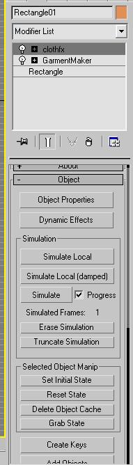 Şimdi nesnemiz seçili iken modify paneline geçip clothfx i uyguluyorum.Gördüğünüz gibi yanda görünen bir panel açıldı. Bunları Basitçe anlatmak gerekirse. Object Properties ten kumaşımızın genel özelliklerini yapıyoruz( bunu birazdan yapıcaz ) dynamic effects te ise hava olaylarını ekleyebiliyoruz yani bir wind ekleyip kumaşın belirli bir yöne doğru uçmasını sağlayabiliriz.Simulate ile ise nesnenin hesaplamasını yapmamızı sağlıyor. Eğer yanlış bir şey yaparsanız alt kısımda Reset State var buna basarak hesaplamaların tamamını sıfırlayabilirsiniz.