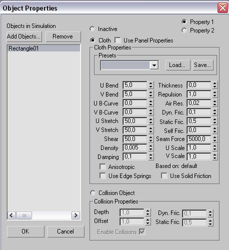 Şimdi nesnemizin kumaş özelliğini veremeye geldi.Deminde dediğim gibi nesnemizi seçerek Object Properties e tıklayalım. Karşınıza bir menü panel gelecek bu panelde gördüğünüz gibi burada nesnemizin özelliklerini verebiliyoruz cloth butonuna tıklayarak nesnemizin bir kumaş olduğunu belirmeliyiz aksi taktirde simule ederken nesnemiz bir hareket kazanmayacaktır. Presets kısmında da bir kaç tane hazır ayarlar bulunmakta bunlardan da seçebilirsiniz. Fakat hepsinin ayrı bir özelliği vardır. Birde add Objects i anlatmak gerekirse dışardan nesne eklemenizi sağlar mesela kumaşımız bir yere düşsün derseniz add objects diyerek nesne ekleyip al kısımda collision object e tıklayarak ta bunu kumaşın düşeceği bir nesne olduğunu belirtirsiniz eğer bu gibi işlemler yapacaksanız yani kumaşın bir nesne üzerinden kayarak yere düşsün gibi işlemler yapacağınız zaman bu aracı kullanacaksınız. Şimdilik rectangle ye cloth uygulamamız  yeterli olacaktır.