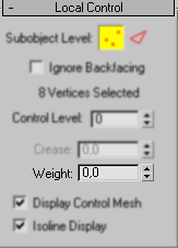 |  | Kontrol noktalarına atanan ağırlıklar eşit olduğundan meshsmooth objeyi kontrol noktasının merkezine doğru çekecektir. Bu işlemi balık ağları gibi düşünebiliriz. Ağı çektikçe balıklar birleşmekte ve ağ yuvarlak bir şekil almaktadır. Kontrol noktalarının ağırlıkları meshsmooth modifier vetex konumundayken vertexlerin seçilip, yakarıda ki şekilde yeralan değer oynayarak değiştirilebilir. Bütün noktaların aynı anda seçilerek ağırlık (Weight) değerinin arttırılması objede bir değişiklik yapmaz. Çünkü kontrol noktaları eşit miktarda kuvvet uygularlar. Birçok durumda meshsmooth modunda ağırlık değiştirmek yerine, editablepoly konumundayken daha kontrollü bir şekilde yüzey ekleyerek bu işlemi yapmak tercih edilmektedir. |