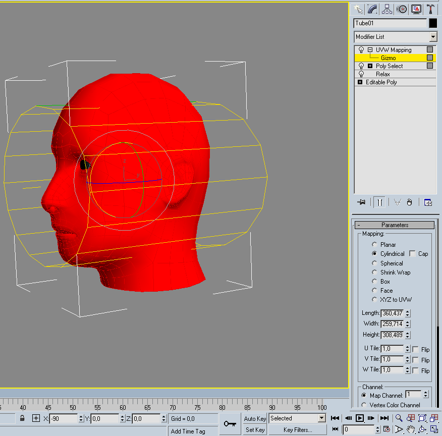 |  Daha sonradan UVW Mapping atayarak Cylindirical seçeneğini işaretliyoruz. Fakat Mapping istediğimiz gibi değil. Bu yünden X yönünde -90 derece döndürüyoruz. |