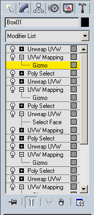 | Bu yüzeylere tek tek UVW Mapping atayarak Unwrap ile düzenlemeniz gerekir.  Bu noktada böyle bir işlemler zinciri yapmanız gerekir. |
