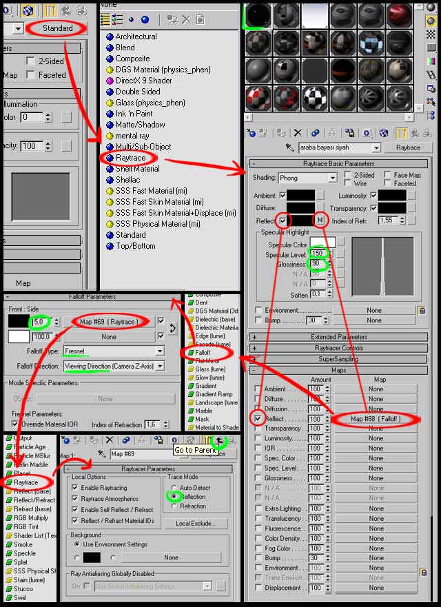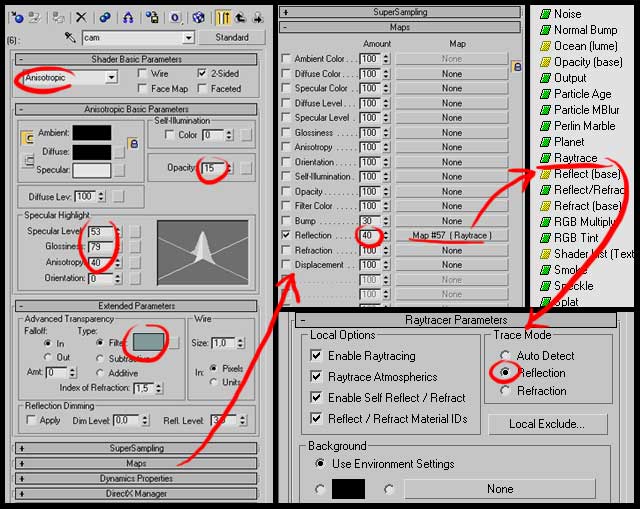 Şimdi sıra camımızda: >> Material Editor´ü açalım boş bir slot seçip isimlendirelim. >> Shader Basic Parameters bölümünden Anisotropic´i seçelim ve 2-Sided´in başındaki kutucuğu işaretleyelim >> Diffuse rengini siyah olarak ayarlayalım. Opacity 15, Specular Level 53, Glossiness 79 ve Anisotropy değerini 40 yapalım. >> Extended Parameters bölümünde Filter rengine tıklayalım açılan pencereye şu değerleri girelim; red 128, green 153 blue 153. >> Map bölümüne geçelim burada reflection değerini 40 yapıp map butonuna tılayalım açılan pencereden Raytace´i seçelim ve Reflection yazısının başındaki kutuyu işaretleyelim.
