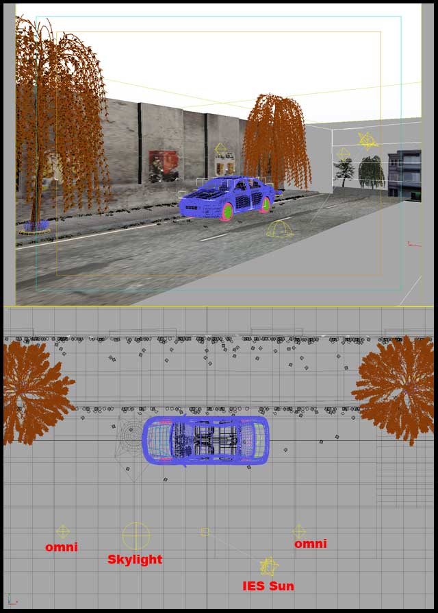 Genel olarak sahnemizden biraz bahsedelim. Arabamızla beraber asfalt, ağaçlar ve duvardan oluşan bir arka planımız var. Bunların dışında yansımada yardımcı olmaları amacıyla kullandığım bazı nesneler var. Aşağıdaki resimde arabanın arka tarafında görülen ev ve ağaçlar sahnemizi çevreliyor bunun dışında en önemlisi sahnemizin hemen üzerindeki Plane. Beyaz ve Self-Illumination değeri 100 olan bu Plane arabamızın üst kısmındaki yansımayı oluşturuyor. En alttaki resimde yansımada yarattığı fark çok açık bir şekilde belli oluyor.