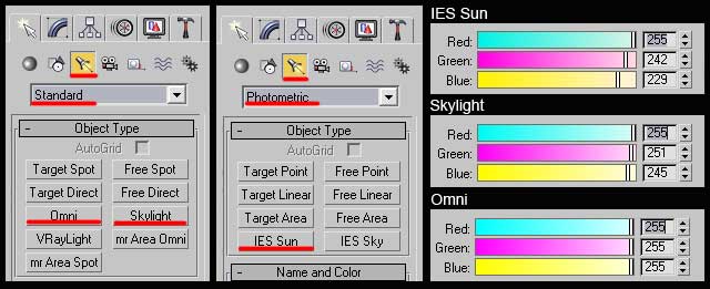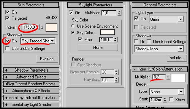 Sahnemizde dört tane ışık oluşturuyoruz: IES Sun, Intensity değeri 1750 olarak ayarlıyoruz. Işığın rengisi ise red 255, green 242 blue 229. Shadows bölümünden on´u işaretleyip Ray Traced Shadows´u seçiyoruz. Skylight, bunda rengi dışında hiçbir değişiklik yapmayalım. Renk değerleri şöyle; red 255, green 251 blue 245. Omni, Sahnemize iki tane aynı değerlere sahip omni yerleştiriyoruz. "Intensity / Color / Attenuation" bölümünden Multiplier değerini 0,2 olarak ayarlayıp ışıklarla işimizi bitiriyoruz.