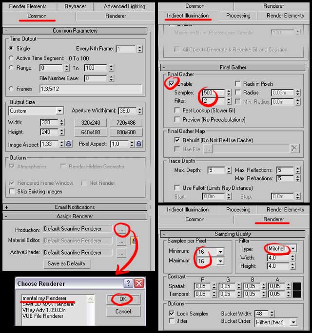 Şimdi sıra son kısımda emeğimizin karşılığını alma vakti geldi. Render >Render´i seçip veya F10 tuşuna basıp Render Scene penceresini açıyoruz. >> Common bölümünden Assign Renderer kısmına geçiyoruz. Buradan Production´i Mental ray olarak seçiyoruz. >> Indirect Illumination bölümünden Final Gather´i etkin hale getirip Samples değerini 500 Filter değerini ise 2 olarak ayarlıyoruz (test renderleri alırken bu değerleri düşük tutarsanız render süresi belirgin ölçüde azalacaktır). >> Renderer bölünde Samples per Pixel kısmındaki Minimum ve Maximum değerlerini 16 olarak ayarlıyoruz ( yine buradada değerleri düşürmemiz render süresini kısaltır). Yüksek çözünürlüklü renderler de Minimum ve Maximum değerlerini düşük tutarsak modellerimizde kırıklı bir görünüme neden olur. Ve son olarak Filter Type´i Michell olarak ayarlıyoruz.