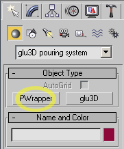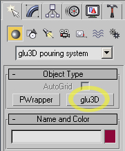 1.Resimde ki gibi glu3d´ yi seçiyoruz, glu3d akışkanın kaynağınıdır.Glu3d´yi seçtiğimiz de sahnemizin ortasına eklenecektir.Standart araçlar ile sağa sola kaydırabiliriz.Sonra yanında ki PWrapper´ a basıyoruz. PWrapper ise akışkanın boyutlarını ayarlama da kullandığımızbir araç.