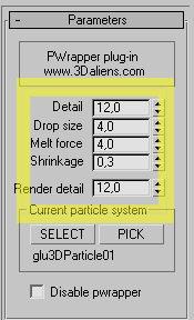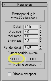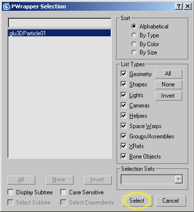 3.Pwrapper´ i seçip Select´e basıyoruz. Gelen menüden glu3DParticle01 ´ i seçiyoruz. Burada akışkan kaynağını seçiyoruz.
