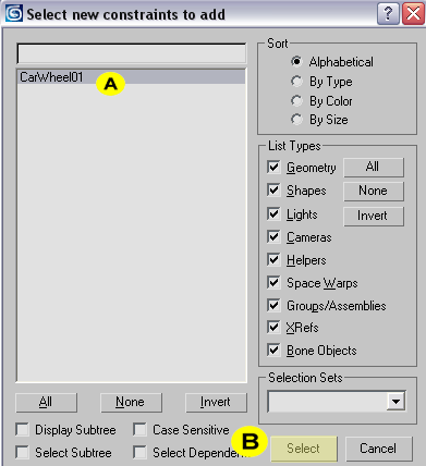 nesnesine tıklayalım. None yazısı RBcollection01 e dönüştübu bölümün alt tarafında 3 adet buton göreceksiniz Pick, Add, Delete buradan sadece Add butonuna tıklayalım select new constraints to add menüsü açılacak buradan carwheel01
