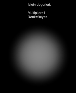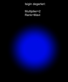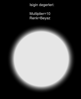 (Asagida resimlerin üzerinde sadece standart ayarlarin degismis olanlarini göreceksiniz. Resimler üzerinde yazmayan ayarlar isigi sahneye ekledigimiz halindeki standart degerlerdir.)