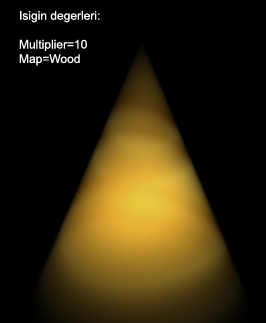 -Isigin türüne göre etki de farkli gözükür. Omni´yi Light Type ile Spot ve Directional´a cevirerek farkli ayarlar deneyelim.  Önce Spot isiga bir bakalim: