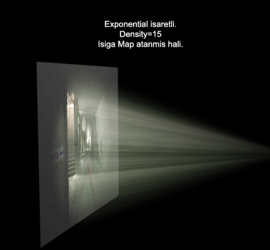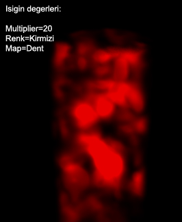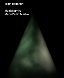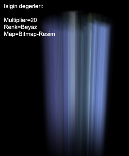 -Isigin Advanged Effects menüsü altindaki Projector Map, Volume Light´a da etki eder. (1.Bölümde bir Spot isigin Projector Map´ine bir resim ekleyerek Sinema etkisi elde etmistik. Bakalim Omni isikta bu etki nasil olacak.) Yukaridaki sahne yine ayni, sadece daha canli gözüksün diye isigin Multiplier degerini 4 yaptim.