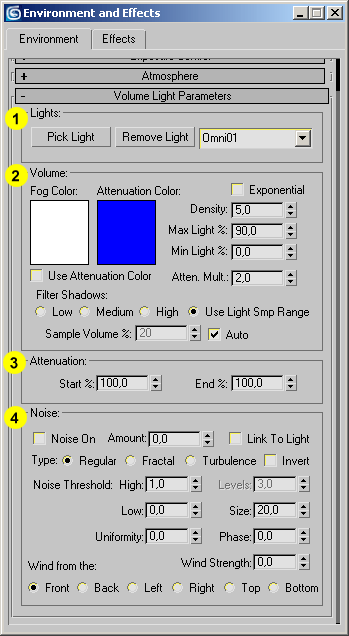Yukaridaki örneklerin cogunda sadece isigin rengini ve isiga atadigimiz map´i degistirerek bir cok farkli sonuc elde ettik. Bu etkileri isigin ayarlariyla oynayarak kendiniz cogaltabilirsiniz.  Volume Light efektinin etkilerini 2 yolla degistirebilecegimizi söylemistik. Simdiye kadar gördükleriniz sadece isik ayarlarini degistirerek elde ettigimiz etkiler. Simdi gelelim isiktan bagimsiz olan asil Volume Light ayarlarina... 2. Volume Light´in etkilerini isiktan bagimsiz olarak degistirebilecegimiz kendi ayar penceresi vardir. Sahnede secili olan isigimizin Atmospheres&Effects basligi altindaki listeden (asagida soldaki 1.resim) Volume Light´i secip Setup´a bastigimizda, asagida sol taraftaki 2.resimde gördügünüz "Environment and Effects" penceresi acilir. Ilk acildiginda biraz karisik gelebilir ama en basta da belirtmistik bu pencerede bize lazim olan isiklarla ilgili sadece iki baslik var: Atmosphere ve Volume Light Parameters.  Simdi birden kafamiz karismasin diye diger basliklari kapatalim ve Atmosphere basligi altindaki ayarlara bakalim.