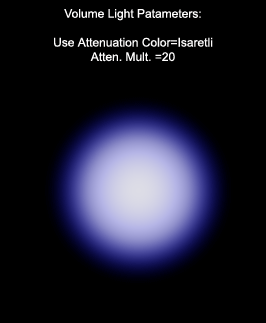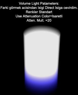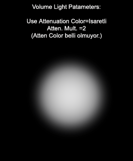 |  | Volume Bölümü: Bu bölümde isigin hacimsel etkisinin rengi ve yogunlugu üzerinde degisiklikler yapabiliriz.  Fog color: Beyaz alana basarak acilan renk paletinden efektin rengini ayarlayabiliriz. Daha önce, isiklarin etkisinin de efekti etkiledigini görmüstük. Eger isigin rengi ile buradaki Fog Color renginin ikisini birden degistirirseniz alakasiz bir renkle ya da siyah bir ekranla karsilasabilirsiniz. Bu yüzden ya isigin rengi beyaz kalmali veFog Color ile renk verilmeli ya da Fog Color beyaz kalmali ve isigin kendi rengi ile renk verilmeli. Attenuation Color: Isiklarin Attenuation ayarlari gibi Volume Light´in da baslangic ve bitis noktalari arasindaki gecisi saglayan Attenuation ayari vardir. Bu ayari 3 ile numaralandirilmis bölümde görücez. Eger altindaki "Use Attenuation Color" kutucugu isaretli ise burada belirleyecegimiz renk isigin kaynagindan bitisine dogru bir gecisle görünür olacak.  Use Attenuation Color: Isaretli oldugunda Attenuation Color ile belirledigimiz renk görünür olur. Atten. Mult: (Mantik sirasini bozmamak icin aciklamada sirayi biraz bozmak zorunda kaldim) Use Attenuation Color kutucugunun sag tarafinda bulunan bu deger Attenuation Color ile belirledigimiz rengin siddetini ayarlamaya yarar. |  Bu bölümdeki diger ayarlara gecmeden isterseniz renk ve Attenuation degerlerini biraz test edelim: