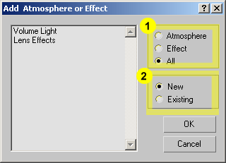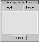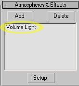 Yukaridaki örneklerin cogunda sadece isigin rengini ve isiga atadigimiz map´i degistirerek bir cok farkli sonuc elde ettik. Bu etkileri isigin ayarlariyla oynayarak kendiniz cogaltabilirsiniz.  Volume Light efektinin etkilerini 2 yolla degistirebilecegimizi söylemistik. Simdiye kadar gördükleriniz sadece isik ayarlarini degistirerek elde ettigimiz etkiler. Simdi gelelim isiktan bagimsiz olan asil Volume Light ayarlarina... 2. Volume Light´in etkilerini isiktan bagimsiz olarak degistirebilecegimiz kendi ayar penceresi vardir. Sahnede secili olan isigimizin Atmospheres&Effects basligi altindaki listeden (asagida soldaki 1.resim) Volume Light´i secip Setup´a bastigimizda, asagida sol taraftaki 2.resimde gördügünüz "Environment and Effects" penceresi acilir. Ilk acildiginda biraz karisik gelebilir ama en basta da belirtmistik bu pencerede bize lazim olan isiklarla ilgili sadece iki baslik var: Atmosphere ve Volume Light Parameters.  Simdi birden kafamiz karismasin diye diger basliklari kapatalim ve Atmosphere basligi altindaki ayarlara bakalim.