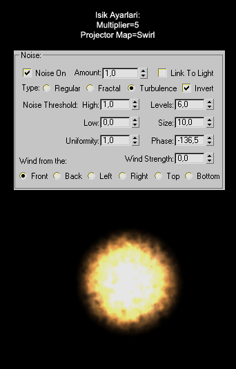 (Asagida resimlerin üzerinde sadece standart ayarlarin degismis olanlarini göreceksiniz. Resimler üzerinde yazmayan ayarlar isigi sahneye ekledigimiz halindeki standart degerlerdir.)