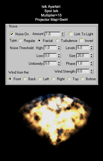 -Isigin türüne göre etki de farkli gözükür. Omni´yi Light Type ile Spot ve Directional´a cevirerek farkli ayarlar deneyelim.  Önce Spot isiga bir bakalim: