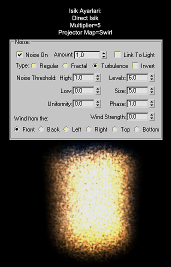 -Isigin Advanged Effects menüsü altindaki Projector Map, Volume Light´a da etki eder. (1.Bölümde bir Spot isigin Projector Map´ine bir resim ekleyerek Sinema etkisi elde etmistik. Bakalim Omni isikta bu etki nasil olacak.) Yukaridaki sahne yine ayni, sadece daha canli gözüksün diye isigin Multiplier degerini 4 yaptim.