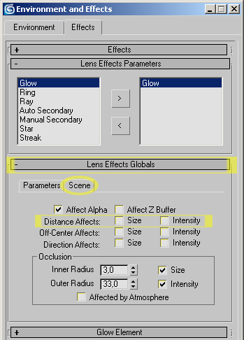 |  |  Lens Effects Globals: Scene: Bir efektin sahnedeki büyüklügü ve yogunlugunu               cesitli sekillerde degistirebiliriz. Bunun birinci seklini yukarida               Lens effects Globals basligi altindaki Parameters bölümünde               gördük. Ikinci olarak asagida görecegimiz, efektin               kendine ait ayarlarla oynayarak da bunu yapabiliriz. Fakat bu degisiklikler isigin sahnedeki konumundan bagimsiz olarak               ayarlanir. Yani sahnedeki isigimizin büyüklügünü               30, yogunlugunu da 50 yaptik diyelim. Isigi kameradan ya da perspektif               penceresinden ne kadar uzaklastirirsak uzaklastiralim yogunlugu               ve büyüklügü degismez. Buna alternatif olarak solda gördügünüz sari               ile isaretli olan Distance Affects bölümündeki               kutucuklari isaretledigimizde isigin sahnedeki yeri de önem               kazanir. Ve isik kameradan uzaklastikca efektin boyutlari kücülür               ve yogunlugu da azalir. |  Simdiye kadar bir sürü laf ettik ama ortada bu efektlerin ne         gibi sonuclar verdigine dair bir fikrimiz yok. Umarim yukarida anlattiklarimdan         Lens Effects´in genel kullanim mantigini anlamissinizdir. Simdi de bu         efektlerin nasil etkiler yaptigini görebilmemiz icin bir kac deneme         yapalim. Basta da söyledigim gibi cok fazla ayrintiya girmeden (ayrintilara         girersek bu dersi de 5-6 bölüme ayirmam gerekir) kisa kisa hangi         efektin ne gibi sonuclar verecegine bakalim.