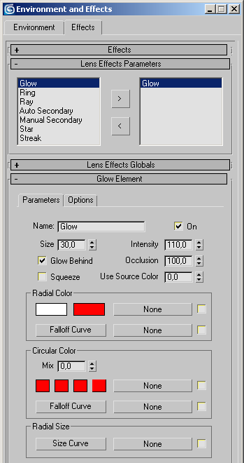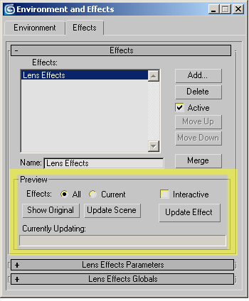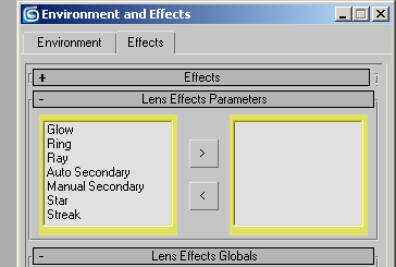 Bu yüzden ilk önce 1. ve 2. Bölümdeki ayarlari ve         kullanilislarini okumanizi tavsiye ediyorum.  Bu         dersin 1.Bölümü olan Bölüm 1- Standard         Isiklar´a gitmek icin buraya tiklayin. Bu         dersin 2.Bölümü olan Bölüm 2- Atmospheres&Effects-         Volume Light´a gitmek icin buraya tiklayin. Bir önceki derste bir isiga nasil efekt atayacagimizi görmüs,         atayabilecegimiz iki efektten birincisi olan Volume Light´i incelemistik.         Simdi 2.Secenegimiz olan Lens Effects´e bir bakalim. Lens Effects, bir isigin kameranin lensinde yaptigi etkileri taklit etmemizi         saglar.  (Lens Effects´e baslamadan önce sunu belirtmem lazim: Lens Effects         gurubunda bulunan 7 farkli efekt vardir ve bu efektlerin herbirinin ayarlari         bir kac degisiklik disinda birbirine benzer. Hem bu yüzden hem de         bu tür efektlerin özel durumlar haricinde cok fazla bir kullanim         alani olmadigini düsündügümden bu efektlerin ayarlarini         ayrintili anlatmayi gereksiz görüyorum. Genel olarak nasil bir         mantikla kullanildiklarini anlatip, sadece önemli gördügüm         birkac ayari aciklamaya calisicam.)                   |  | Sahnemize yine bir Omni isik ekleyelim ve Atmospheres&Effects bölümünden               bu isiga Lens Effects atayalim. Ve yine hicbir ayari degistirmeden               isigimiz üzerinde yaptigi etkiyi görmek icin bir render               alalim. Bakalim Volume Light efektinde oldugu gibi yine bembeyaz               bir sonuc mu elde edecegiz. (Lens Effects de Volume Light´da oldugu               gibi, sadece Perspektif ve Camera görüslerinde render´da               görünür. Sahnenin diger objelerinin renderi bittikten               sonra Lens Effects ayrica hesaplanir ve sahneye eklenir.)      |  Bu sefer siyah bir render´imiz oldu. Isigimiz acik olduguna göre         bu durum efektin isiga etki etmedigini gösteriyor. Bunun nedenini         söyle aciklayabiliriz: Lens Effects cogul bir ifadedir. Icinde 7 ayri Lens Efekti´nin bulundugu         bir Efekt gurubunun adidir. Biz bu gurubu isiga atadik, ama bu gurup icinden         hangisinin ya da hangilerinin isigi etkileyecegini de belirlememiz lazim.         (Bir isiga birden fazla Lens Efekti ekleyerek degisik sonuclar elde edebiliriz.)         Bunu belirleyebilmek icin de Lens Effects´in ayarlarina ulasmamiz gerekiyor.         Önceki derste isiga atanmis bir efektin ayarlarina nasil ulasacagimizi         görmüstük. Bunun icin isigimizin Atmosphere & Effects         bölümündeki Lens Effekts´i isaretleyip Setup´a basalim         ve Enviroment and Effects penceresine ulasalim.                    |  | Environment and Effects Penceresi Bu pencereyi de bir önceki dersten taniyoruz. Volume Light               degerlerini de bu pencere araciligiyla degistirmistik. En üstte               bulunan Enviroment ve Effects basliklarini kullanarak Volume Light               ve Lens Effects bölümleri arasinda gecis yapabiliriz. Soldaki resimde gördügünüz Effects basligi               altinda bulunan bölümün üst kismi Volume Light´da               gördügümüz mantikla isler. Sadece altindaki               sari cizgiyle isaretlenmis Preview bölümü Volume               Light´da yoktu. Bakalim bu bölüm nasil bir görev               görüyor: Preview:  Yukarida Lens Effects´in render´dan sonra ayrica hesaplandigini               ve bu hesaplama bittikten sonra render penceresinde göründügünü               söylemistim. Bu bölümü kullanarak Lens Effects               üzerinde yaptigimiz degisikliklerin etkilerini, tekrar bütün               sahneyi bastan render almamiza gerek kalmadan görebiliriz. Önce dügmelerden baslayalim. Show Original: Bu dügme aslinda bir secenek               menüsü görevi görür. (Bana göre, zaten               yüzlerce özelligi bulundugu icin yeterince karisik görünen               Max programinda, insanlarin kafasini iyice karistirmak icin dügme               olarak konulmustur :) Ve bence Max´deki bir cok bölümdeki               bu tür menülerde bir standart kullanilmamasi, programi               oldugundan daha karisik hale getiriyor. Daha da kötüsü               anlatimini da zorlastiriyor:))  Neyse konumuza dönelim. Bu dügme render penceresinde Lens Effects´i kapatip acmaya               yarar.Sahnenizde Render aldiktan sonra bu dügmeye bastigimizda               Render penceresinde Lens Effect görünmez olur. Bu arada               bu dügmenin ismi de degisip Show Effects olur.               Tekrar bastiginizda Lens Effects yeniden render penceresinde görünür.               Ve dügmemiz tekrardan Show Original halini               alir. Update Scene: Render dügmesiyle ayni isi               görür, sahnenin yeniden renderini alir ve efekti yenider               hesaplar. Update Effect: Sadece efekti tekrardan hesaplar. Effects: All isaretli oldugunda               isiga atadigimiz efektlerin hepsi tekrardan hesaplanir. Current               isaretli ise sadece en son yaptigimiz degisiklik hesaplanir. Interactive: Bu kutucuk isaretli oldugunda Update               Effect dügmesine basmamiza gerek kalmadan yaptigimiz               her degisiklik aninda hesaplanir. Birkac efekti ayni anda kullaniyorsak               bu kutucugun isaretli olmasi calismamizi yavaslatabilir. |  Yaptigimiz efektler üzerindeki degisikleri tekrar render almadan         nasil hesaplattirabilecegimizi gördük. Ama sahnemizde henüz         bir efekt görünmüyor.  Lens Effects gurubunu isiga atmistik, ama bu gurup icinden hangisinin         ya da hangilerinin isigi etkileyecegini henüz belirlemedik. Bunun         icin Enviroment and Effects penceresindeki ikinci baslik olan Lens         Effects Parameters´i acip incelemeye baslayalim.                    |  | Lens Effects Parameters: Bu baslik altinda sari ile isaretlenmis iki liste görüyorsunuz.             