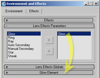 Iki liste arasindaki sag ve sol oklarla, soldaki listelerden sectigimiz               efektleri isigi etkilemesi icin sagdaki listeye ekleyebilir ya da               sagdaki listeden sectigimiz bir efekti, isiktan kaldirabiliriz.              Isigimizin etkilendigi efektleri gösteren sagdaki listemiz               bos.      |  Simdi listedeki ilk efekt olan Glow´u isaretleyip ortadaki sag tarafi gösteren       oka basarak sagdaki listeye ekleyelim.