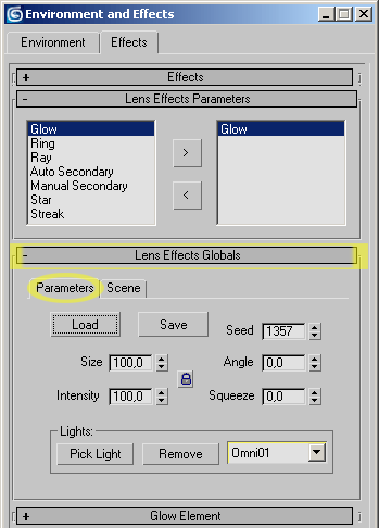 Render´da gördügünüz gibi günes isigina benzer         bir etki olustu.  Isigin rengi disinda, kendi ayarlari üzerinde yaptigimiz         degisiklikler Lens Effects üzerinde bir degisiklik yapmaz. Sadece         Lens Effects kamerayi hedef aldigindan, isigin sahnedeki yerine göre         bazi efektlerin etkileri biraz farkli olur. Bunun yaninda isigin türünü         degistirdigimizde bile etkisi degismez. Bir Omni isik ile bir Spot isiga         atanan Lens Efekti ayni sonucu verir. Lens Efektlerinin etkilerini kendilerini         ait penceredeki ayarlarla degistirebiliriz. Efektlerin ayarlarina gecmeden önce bütün efektleri ortak         olarak etkileyen Lens Effects Globals ayarlarina bir         gözatalim.                    |  |  Lens Effects Globals: Yukarida da bahsettigim gibi bu baslik altindaki ayarlarda yapilan               degisiklikler, isigimizi etkilemesi icin sag taraftaki listeye eklenmis               bütün efektleri etkiler. Bu bölüm de Parameters ve Scene               olarak iki bölüme ayrilmistir.  Önce Parameters´dan baslayalim: Load:  Bu dügmeye bastigimizda acilan pencereden               daha önceden hazirlanip kaydedilmis efektleri cagirabiliriz.              Save: Bu dügme ile hazirladigimiz efekti               daha sonra da baska sahnelerde kullanabilmek icin kayitedebiliriz. Size: Efektlerin büyüklügünü               ayarlamamiza yarar. Intensity: Efektlerin yogunlugunu ayarlamamiza               yarar. Bu iki ayarin sagindaki kilit resmine bastiginizda bu iki ayardan               herhangi birinde yaptiginiz degisiklik diger ayari da ayni oranda               degistirir. Pick Light, Remove ve yanindaki secim listesini kullanarak bu efektlerin               sahnede hangi isiklari etkileyecegini belirleyebiliriz. Bunun detayli               anlatimini bir önceki bölümde görmüstük. |