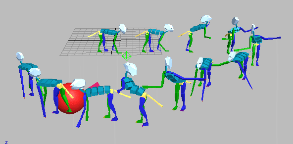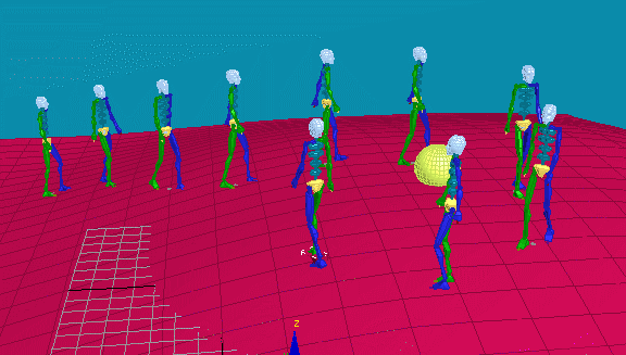 Aynı hareket dosyalarını ve zinciri kullanarak, bu kez eğri bir yüzey üzerinde Crowd içerisinde "Surface fallow"behaviorunu kullanarak bu animasyon oluşturulmuştur.