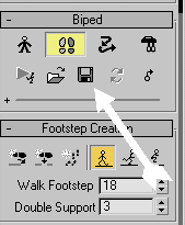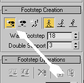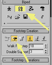 Sahneye Biped´i oluşturun ve seçili iken yukarıda ayak simgesi olan "footstep modu"na tıklayın ve hemen alt tarafta bulunan tek ayak simgesi "create footstep" simgesine tıklayın (yukarıdaki ikinci resim)