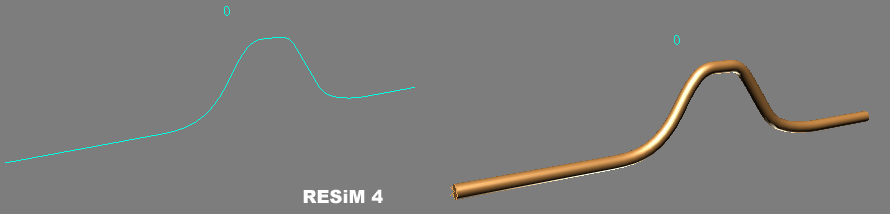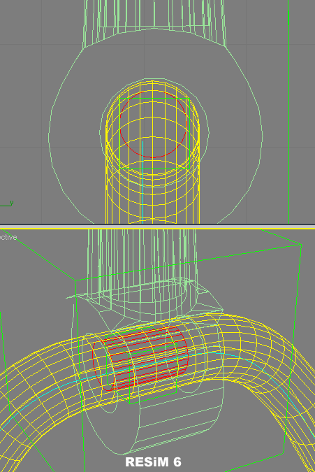 | 4) Krank mili için, line ile çizgiyi çizip,onu alt nesne aşamasında vertexlerini düzenleyerek ( bezier kolları ) kabaca oluşturdum.(alltaki sarı eğri çubuk). Krank milinin çapı kadar bir circle ile loft tekniği yardımı ile krank milini oluşturdum. ( resim 4 ) |