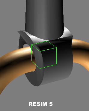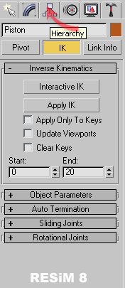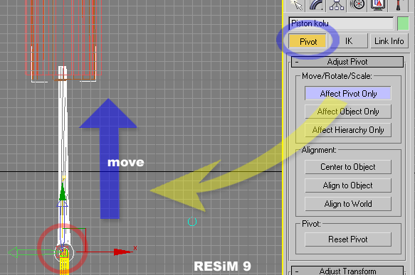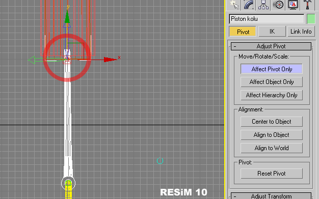 |  | Şimdi buraya DİKKAT !!!!!!!! Piston kolu Şu anda krank mili içine koyduğumuz yardımcı mil (silindir) etrafında /ekseninde/ dönecektir. Oysa biz hem yardımcı milin , hemde pistona bağlı olduğu yerde hareket etmesini istiyoruz.Bu sebeple piston kolunun pivot noktasının yerini değiştirmemiz lazım. Bunu için Hierarchy komut panelindeki pivot kısmında Affect Pivot Only tuşuna basıp pivotu Resim 9´ daki gibi move taşıma tuşu yardımı ile pistonla birleştiği noktaya taşırız. ( Resim 10 ) |