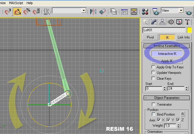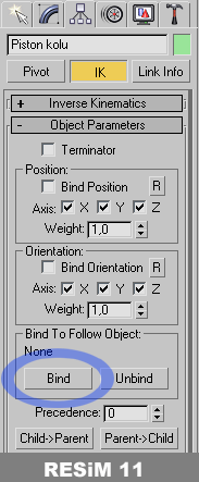 |  | Bu durumda piston kolunun diğer ucunun da krank mili ile beraber dönebilmesi için oraya ikinci bir pivot gibi davranması amacı ile bir dummy yardımcısı ekleriz.( Resim 5´ deki yeşil küp) Dummy yardımcısını Create/Helpers altında bulabilirsiniz. dummy mizide yerine koyduktan sonra tekrar Select and link tuşuna basıp dummy´ i piston koluna bağlarız.( önce dummy seçilmeli ) Bu aşamadan sonra dummy yardımcımızın krank mili içine koyduğumuz silindirimizi ( mil ) takip etmesini sağlamamız gerekiyor... Bunun için: IK panelinde Object Parameters bölümünde ki Bind To Follow Object içindeki Bind tuşuna basıp, dummy ´yi krank mili içersindeki silindire bağlarız. ( Resim 11 ) Artık İnverse Kinematics uygulamaları bitmiş durumdadır.Tek yapmamız gereken interaktive IK tuşuna basmak ve animasyonu yapmaktır. |