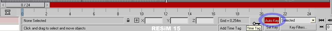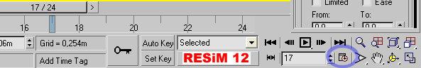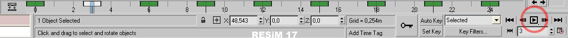 d) Animasyon kısmında Autokey tuşu basılmalıdır.( Tuş bordo renk olacak )bu arada animasyon kayar çubugu 0 (sıfır) konumunda olmalıdır.( Resim 15 )