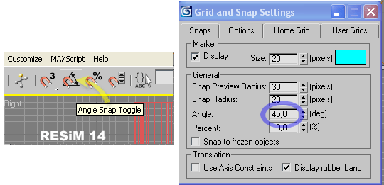 | Krank miline dönme hareketi vermek için: a) IK paneli altında Interactive IK tuşu basılı olacak. b) krank miline select and rotate ile döndüreceğiz. c) krank milini tam 45° döndürebilmek için Angle Snap Toggle tuşuna sağ tıklayıp,çıkan pencerede angle değerini 45 yapmanız ve pencereyi kapamanız yeterlidir.( resim 14 )