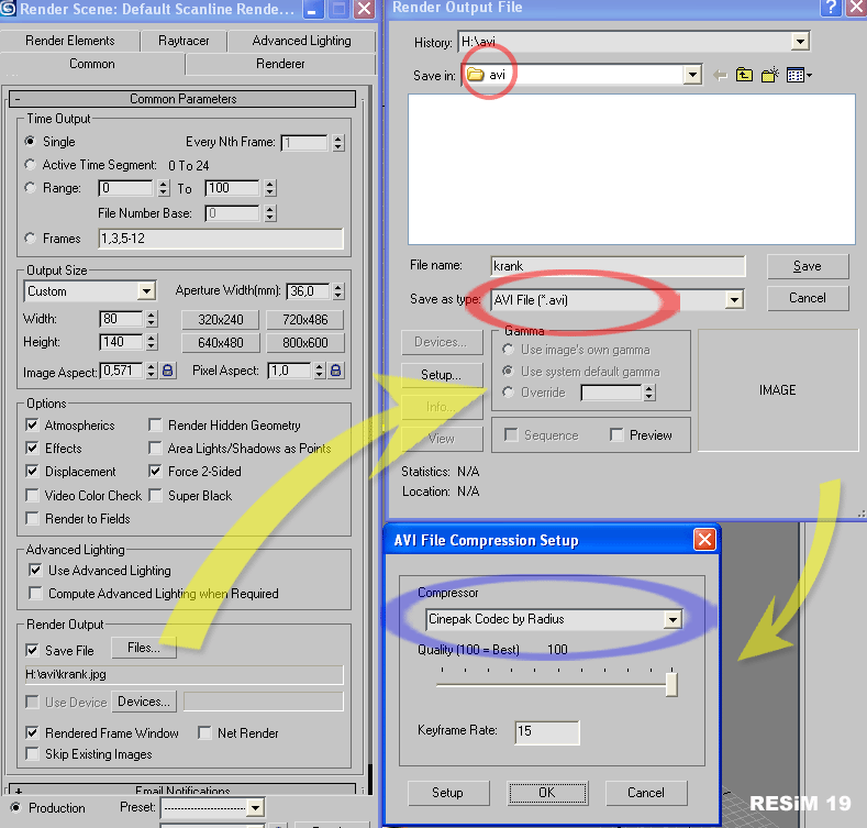 | Render Output kısmındada file ile animasyonu bilgisayarınızın istediginiz yerine kaydedebilirsiniz.Bu arada kayıt esnasında avi formatını seçmeli, save tuşuna basınca çıkan sıkıştırmayı da makinanızda başka codec yok ise Cinepak Codec by Radius olarak seçmelisiniz.( Resim 19 ) |
