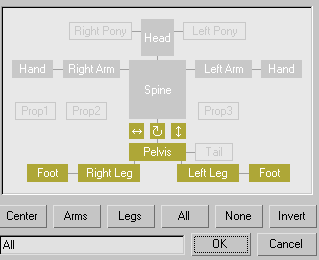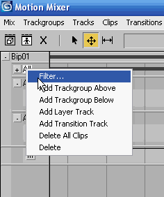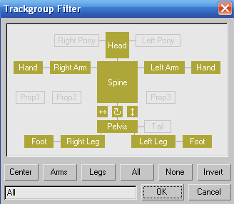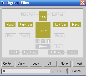 Biraz önce arka arkaya dosya açtığımız bölümün sol üst tarafında bulunan "All" yazısı üzerine mausenizi getirin (Yukarıdaki birinci resim) Sağ tıklayın. Çıkan listeden "Filter..." yazısına tıklayın. Karşınıza yukarıdaki ikinci resimde gördüğünüz "Trackgroup Filter" panosu çıkacaktır. Burada Biped´in bütün eklemleri şematik olarak gözükmekte ve bu şemaları kullanarak her parçaya ayrı bir hareket yükleyebiliriz.