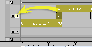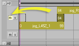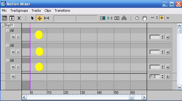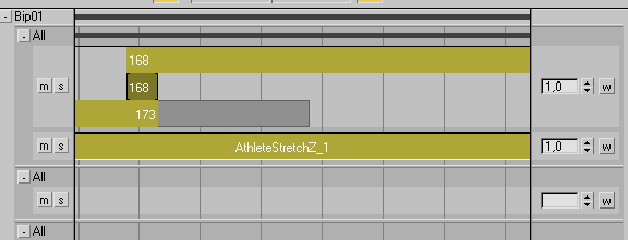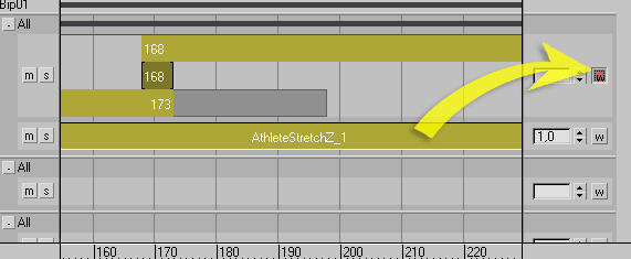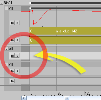 "Add Trackgroup" yazısına her tıklamanızda yeni bir veri bölümü açılacaktır. ( "All" "m" ve "s" harflerinin bulunduğu her bölüm yeni bir veri bölümüdür) Bu her yeni veri bölümünde Biped´in her ayrı parçası için ayrı ayrı hareketler yüklememize yarar. Örneğimize devam ederek bunun ne demek olduğunu daha iyi anlayacağız. Yukarıdaki resimde sarı noktalarla gördüğünüz üç tane yeni bölüm oluşturdum. Siz de yukarıdaki işlemi üç defa tekrarlayarak üç yeni bölüm oluşturun. Şimdi yukarıdaki birinci sarı noktanın bulunduğu veri bölümümüze bakalım.