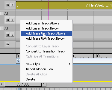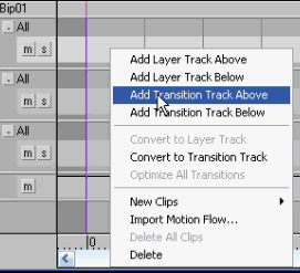 Evet, şimdi gövde kısmıyla işimiz bittiğine göre listemizdeki ikinci bölüme geçerek yeni bir hareket sentezi oluşturmaya geçebiliriz. Şimdide kalça ve ayak kısımları için hareketler oluşturalım. Yukarıda birinci resimde görülen "All" "m" ve "s" işaretlerinin olduğu bölüme mausemizle gelerek sağ tıklayalım. Yukarıdaki ikinci resimdeki gibi açılır listede "Add Transition Track Above" yazısına tıklayalım ve alanımızı genişletelim. Daha önce gövde hareketlerini oluşturmak için yaptığımız işlemlerin aynısını burada da yapacağız.