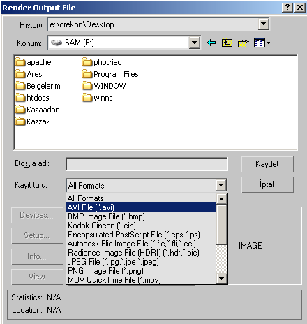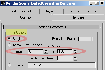 Zaman durumu: Eğer tek bir resim dosyası istiyorsanız bunu Single olarak işaretlemelisiniz. Film dosyası istiyorsanız (veya animasyonu gösteren sıralı resim dosyaları istiyorsanız) Range seçeneği ile animasyonun başlangıç ve bitiş zamanlarını belirtmelisiniz.