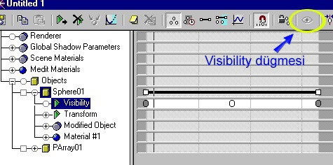 |  | Bu ayarlardan sonra cismimiz daha gerçekçi patlıyor ama kaynak cisim patlama anından sonra yok olmuyor, hala orda bekliyor, o zaman onu yok etmek işi de bize kalıyor, Track Wiev penceresini açıp cisim seçili iken Visibility düğmesine basıyoruz. Cisim seçili değilken Visibility düğmesi görünmez bu sebeple iki saat nerde bu düğme diye aramayın. önce sol taraftan cismin adını seçin sonra düğmeyi arayın. |