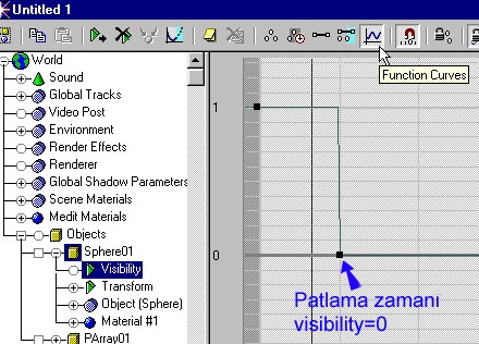 |  | Daha sonra yukardaki menülerden yeni key oluşturup bu keyi tam patlaam zamanında cismi görünmez yapacak şekilde ayarlayın (Key nedir diyenler Özel inceleme kısmından Track View dersine baksın)  |
