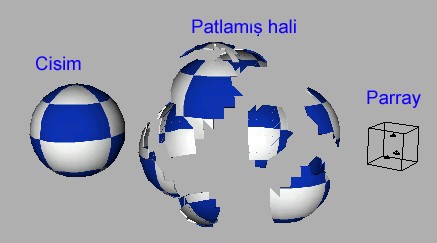 | Herhangi bir cismi bomb ile patlattığınızda cisim parçalanır fakat parçaları çok küçük ve ince olduğundan pek birşeye benzemez. Max içindeki araçlarla gerçekçi patlama yapmak mümkün. Kullanacağımız araç bir particle. Parray (Particle Array)> Öncelikle patlayacak olan cismin yanına bir Parray yapıyoruz. (Bu kısımda menüleri fazla anlatmayacağım, herkes Spray cisminin hangi menüden oluşturulduğunu biliyor, Parray da aynı yerden yapılıyor) Parray cismini yaptıktan sonra önemli kısım  Parray için ayarlamalar yapmakta: