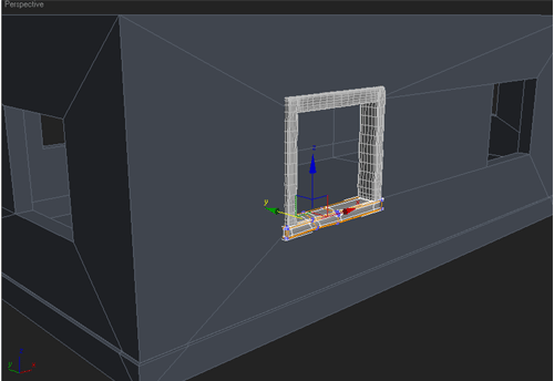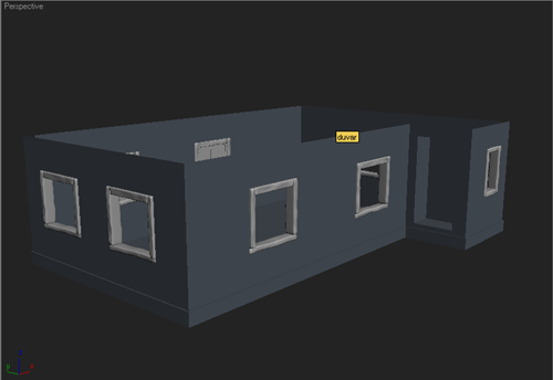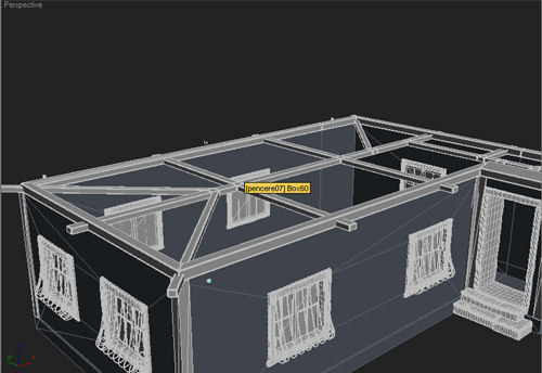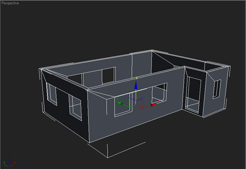 | 4~ Evin pencere ve kapılarını oluşturmak için kutular çizin.Kutuları yerlerine oturttuktan sonra hepsini birbirine "attach" edelim. Duvarı seçip "boolean" kullanarak pencere ve kapı deliklerini oluşturalım ve bunu tekrar poly´e çevirelim, "boolean" kullandıktan sonra oluşan gereksiz "edge"leri silelim Pencerelerde iç ve dış duvar arasında oluşan boşluğu "bridge" kullanarak kapatalım |